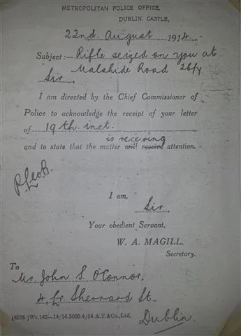 John S. O'Connor joined the Irish Volunteers in December 1913. On the 26th of July 1914, at the age of 16, he took part in the Howth gun-running. Afterwards, on the march back into Dublin City he was stopped on the Malahide Road and had his rifle seized by an officer of the Dublin Metropolitan Police. During the scuffle he was knocked unconscious with the butt of a police rifle and would bear the scar for the rest of his days. A few weeks later he would cheekily send a letter to DMP HQ at Dublin Castle requesting the return of the rifle!